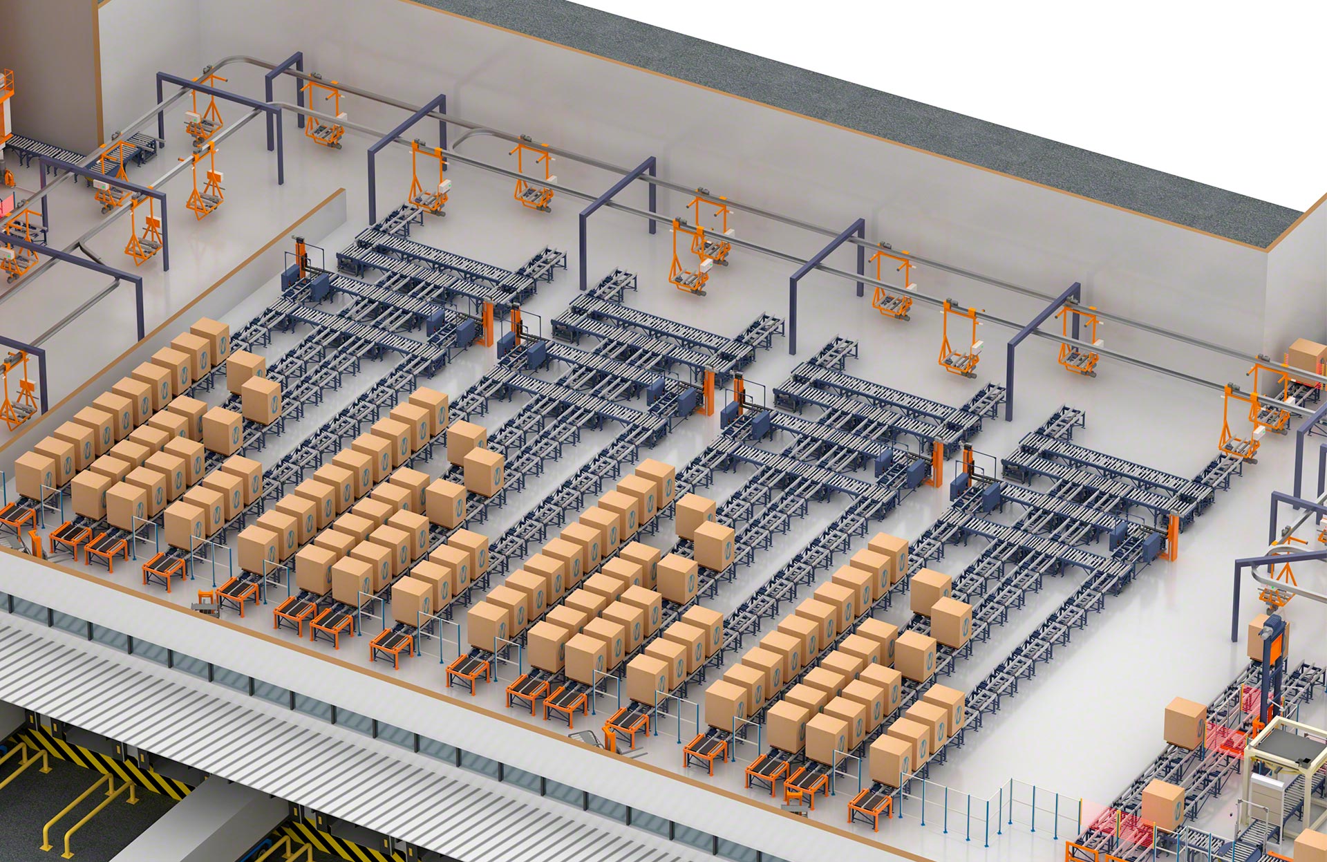 Like electrified monorail systems, pallet conveyor systems are designed to automate the internal flow of palletised loads. Conveyors stand out for their ability to move continuously, fostering the simultaneous transport of large volumes of pallets. Moreover, unlike electric monorail systems, conveyors can accumulate pallets; that is, they can keep them on standby to create a temporary buffer or regulate flows.