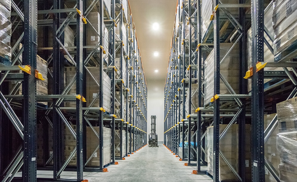 Mecalux has installed drive-in pallet racks for the high-demand products in three frozen storage chambers. Each of these contains a central aisle and two very deep, 5 m high blocks of racks on both sides.
