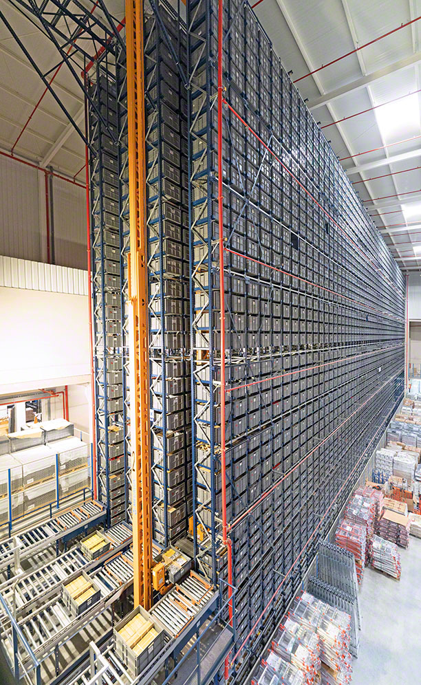 The logistics centre consists of two attached automated storage and retrieval systems (AS/RS): one for pallets with 1,708 locations and another (miniload) for boxes with capacity for 11,024 unit loads. A space next to the AS/RS for boxes has been set aside for future expansion when required by the business. Just beside this area, Mecalux has set up a manual storage zone with pallet racks and picking shelves.