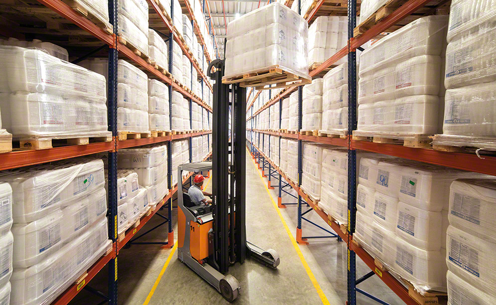The distribution of the goods in the racks takes their features and sizes into account. Pallets are 1,000 x 1,200 mm, although they can be of different weights (from 1,050 kg, up to a maximum of 1,350 kg). For example, lower rack levels are allocated to IBC Pallet Tanks (bulk liquid containers), to prevent the accidental fall of these heavy, dangerous loads. Upper levels are where light-weight products are deposited.