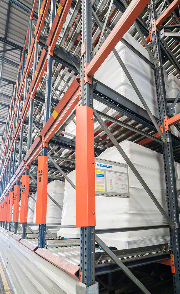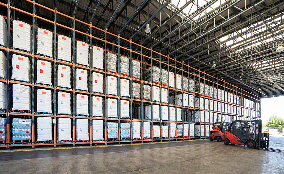 Between 2002 and 2003, Mecalux initially built two 9.5 m clad-rack warehouses with the high-density drive-in system and a storage capacity of more than 15,000 pallets.