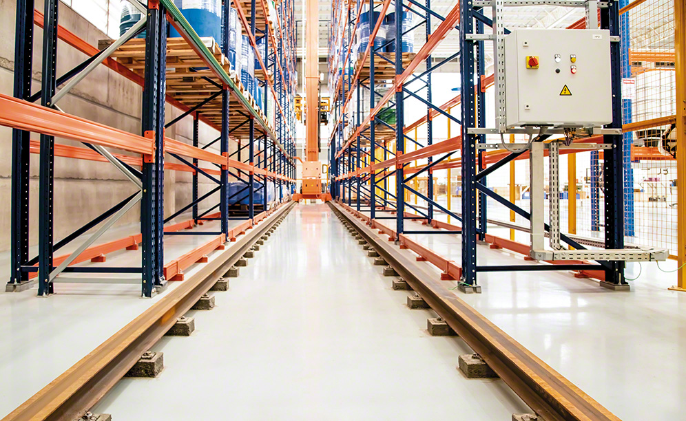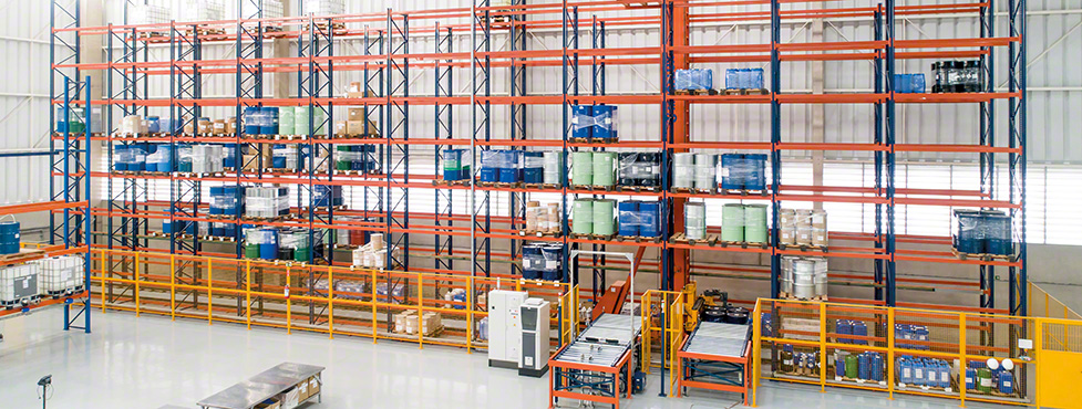 Mecalux has installed an automated warehouse based on these considerations. It comprises a single aisle with single-depth racks on each side measuring 12 m high and 30 m long, with a total storage capacity for 384 pallets. Here is where the company stores all its raw materials in barrels, grouped on pallets to facilitate both handling and transportation.