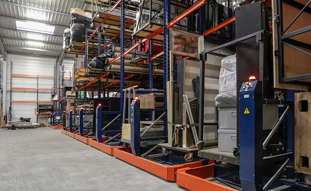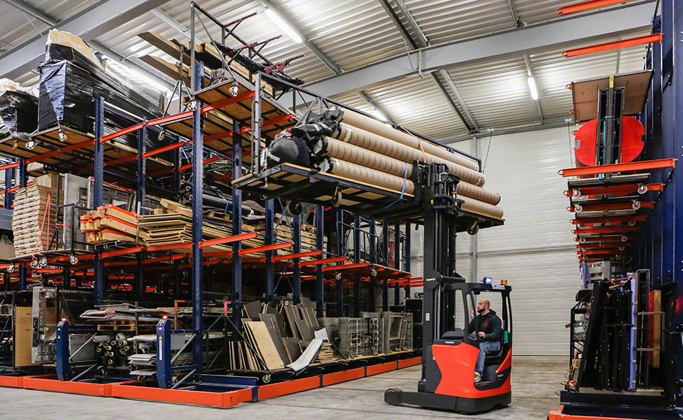 Eleven cantilever racks have been installed on mobile bases where long and bulky loads can be accommodated. Each cantilever rack stands 9 m high, divided into three levels, and runs 14 m long, which allows the maximum use of warehouse space to provide greater capacity.