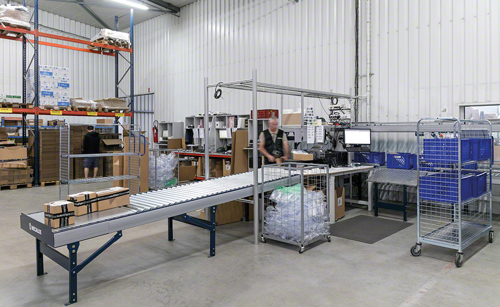 Laure Bridault, logistics director at Algam, explains that "After Mecalux installed a two-level picking mezzanine, we needed a solution that would stop operators from having to climb the stairs to pick items while finalising and consolidating an order in the packing area." Mecalux has installed a box conveyor circuit to achieve this storage goal.