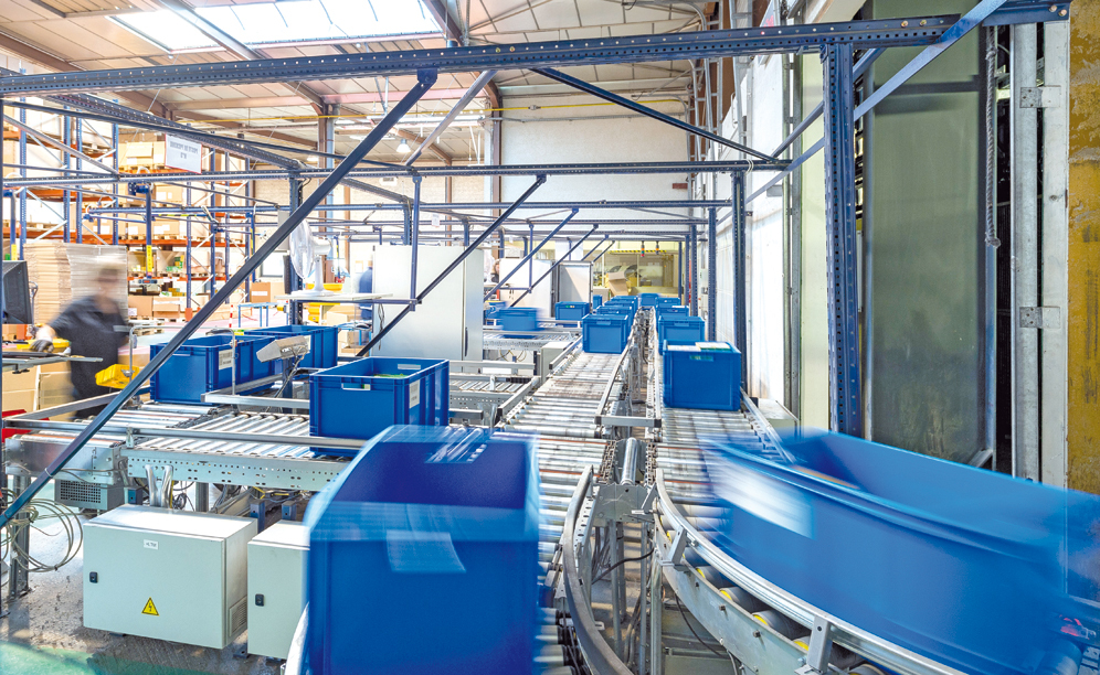 The picking stations, in the shape of a "U", are located terraced perpendicularly to the main conveyors. These conveyors are comprised of a double circuit that allows both the re-circulation of boxes, as well as the connection to the warehouse and the replenishment station. Moving boxes to either of the two main conveyors is direct, thus avoiding unnecessary movements.