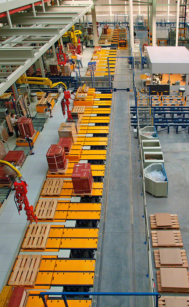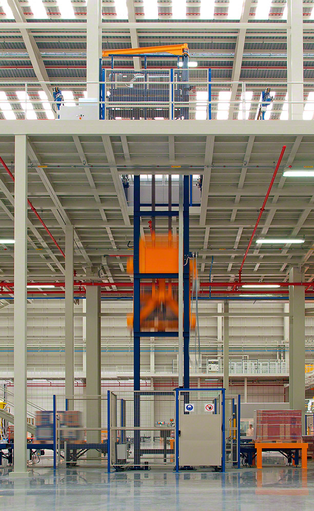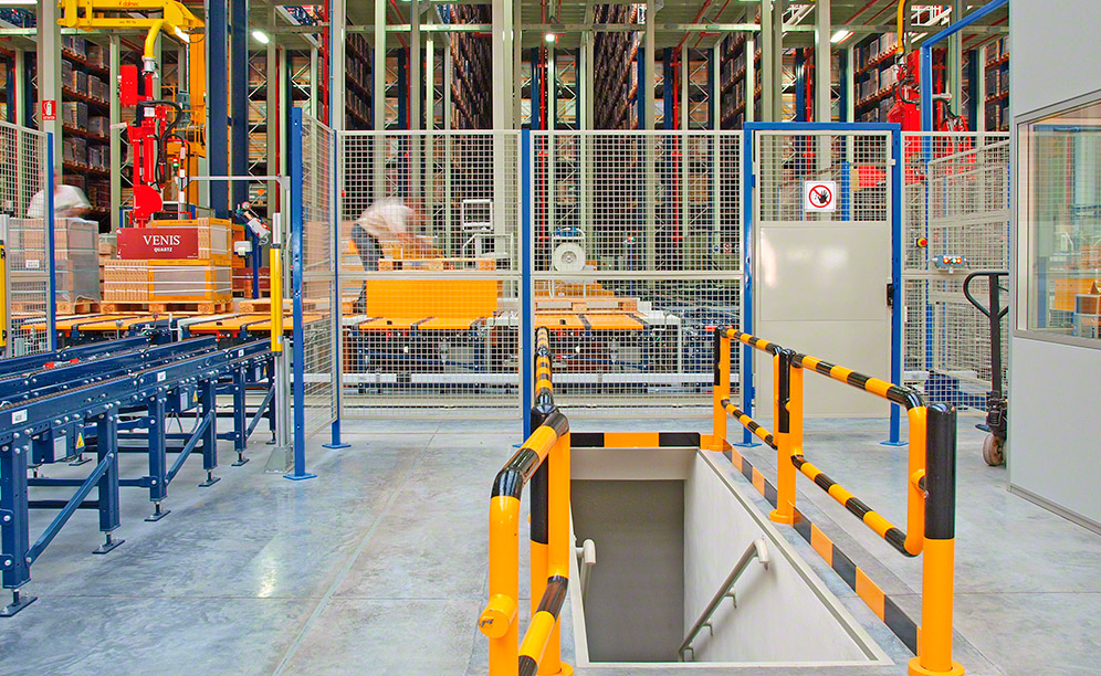 It features dual transport levels at the aisle ends, with inputs carried out on the upper one and outputs on the lower. In all, eight lifts join the two floors, achieving the required workflows. There is a direct input point for goods flowing from production and two additional entry points where pallets from the other centres and empty pallets are inserted. In any case, pallets must pass a rigorous quality control before entering the warehouse.