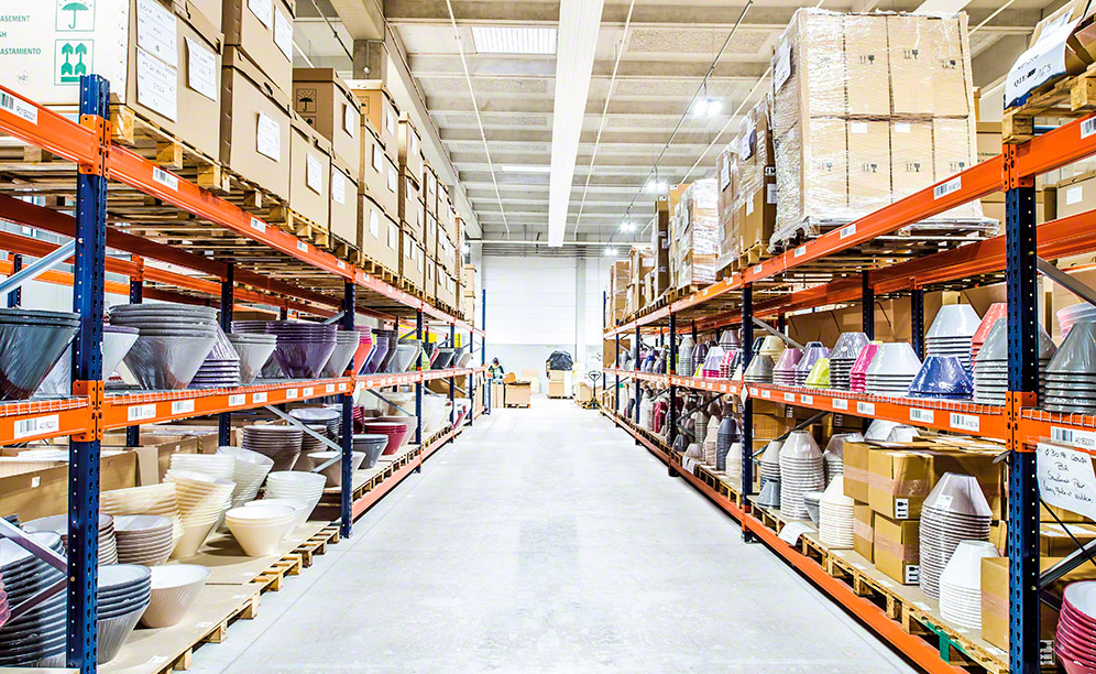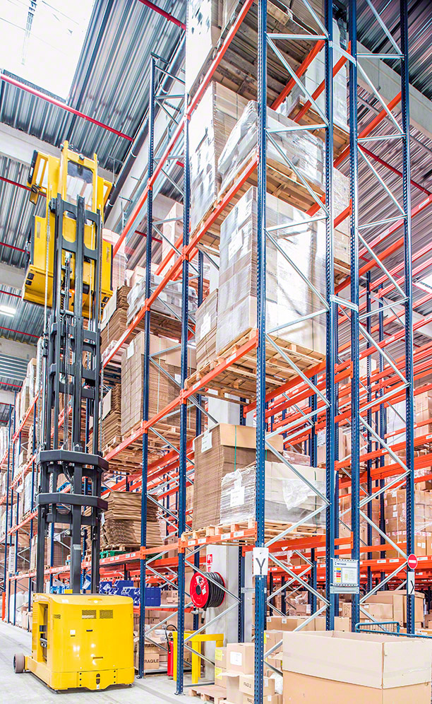 Picking is done directly off the pallets in the lower rack levels, storing product reserves on upper levels.