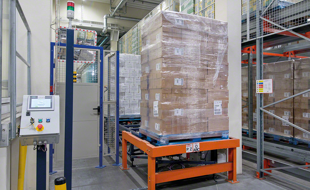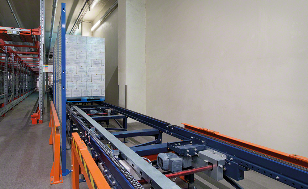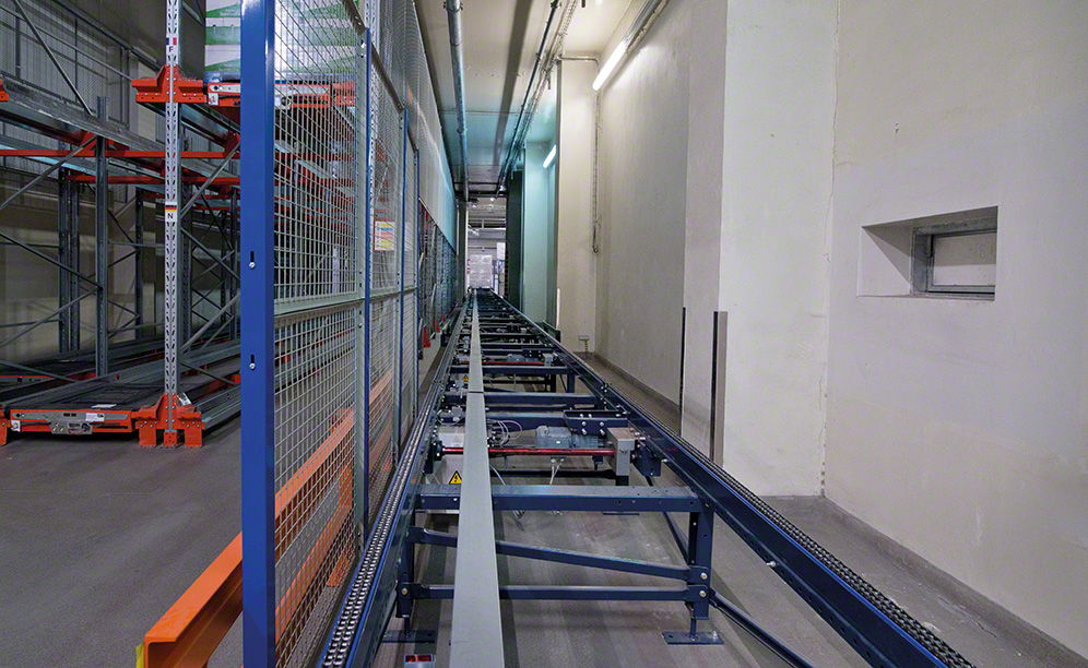- The second exit flows out in front of the loading docks. Once the goods arrive there, the operators extract them from the circuit and insert them directly into the transport lorries. One advantage of this conveyor system is its accumulation capacity. Pallets are grouped one after another in an orderly fashion until the moment they are slotted into the corresponding distribution vehicle.