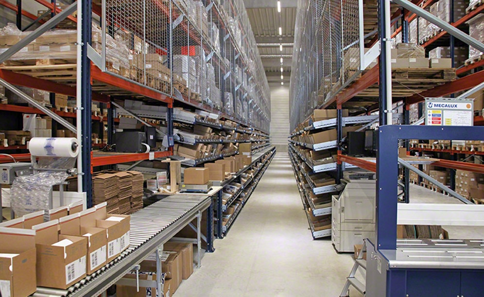 The main advantage of this system is picking and replenishment of goods can be done at the same time, without any interference between the two operations. Operators insert boxes into the different levels in the loading aisle and these move to the opposite end on their own.