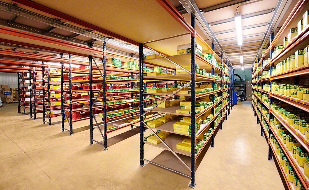 Eagle Spare Parts has a 2,400 m² warehousing facility in the town of Mours-Saint-Eusèbe (France) equipped with Mecalux shelves with walkways. These shelves help to classify goods according to their dimensions and demand level, while providing agility in storage tasks and order fulfilment processes.