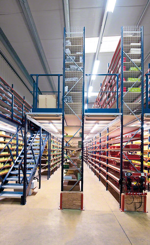 Taking these special features into account, Mecalux has installed 5 m high shelves which support walkways or raised passageways that create two floors, thus doubling the useful storage area.