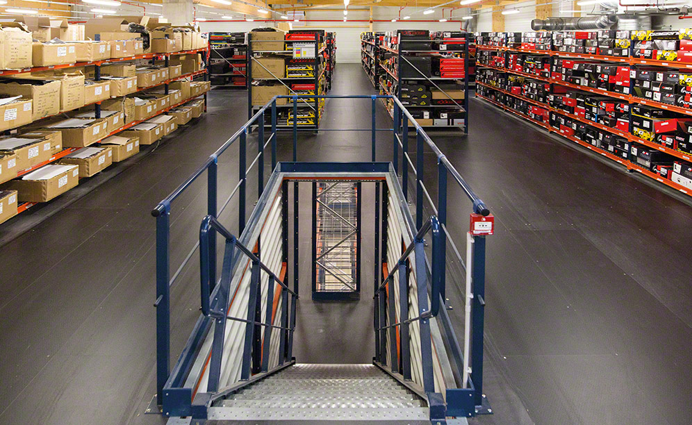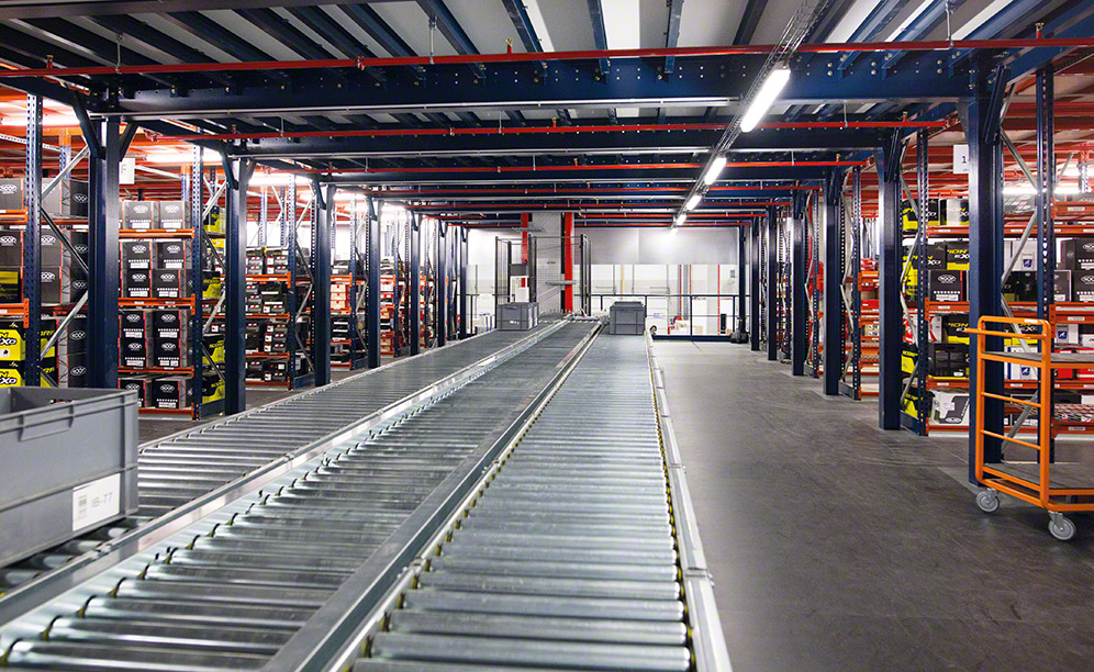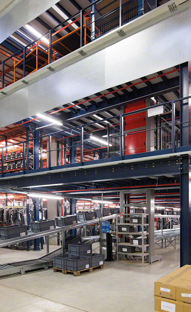 A mezzanine structure is set up in the central aisle, which joins the two blocks of racks with walkways; thus, the conveyor circuit passes through each floor.