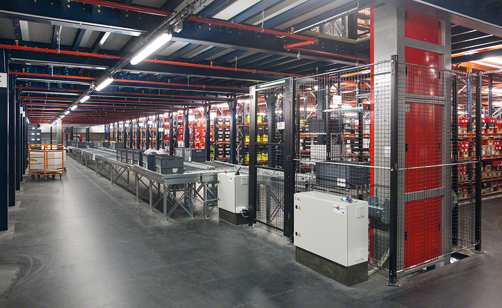 The automatic conveyor circuit bridges the gap between the four warehouse floors and moves the finished orders to the consolidation and sorting zone.