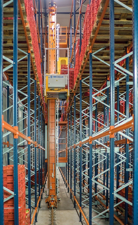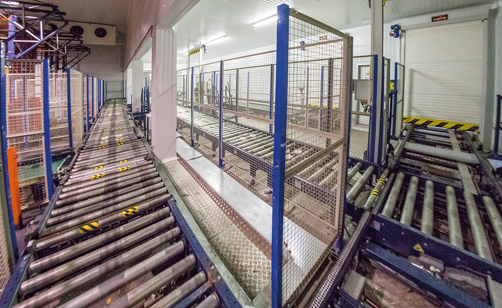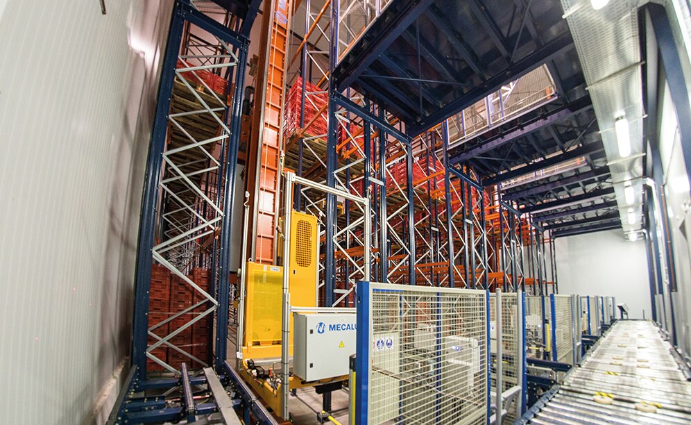 The refrigerated cold storage is composed of five, single-depth aisles. Each is served by a single-mast stacker crane with a cabin on board that rises with the load, which favours handling. These machines move the pallets between the conveyor stations and the corresponding locations in the racks, and vice versa.