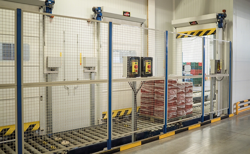 For the purposes of protecting people and goods from possible incidents, all areas where elements are in motion (conveyors, lifts and stacker cranes) were sealed off using metal enclosures, fast-acting vertical roll-up doors, safety devices with laser beams or horizontal grids.