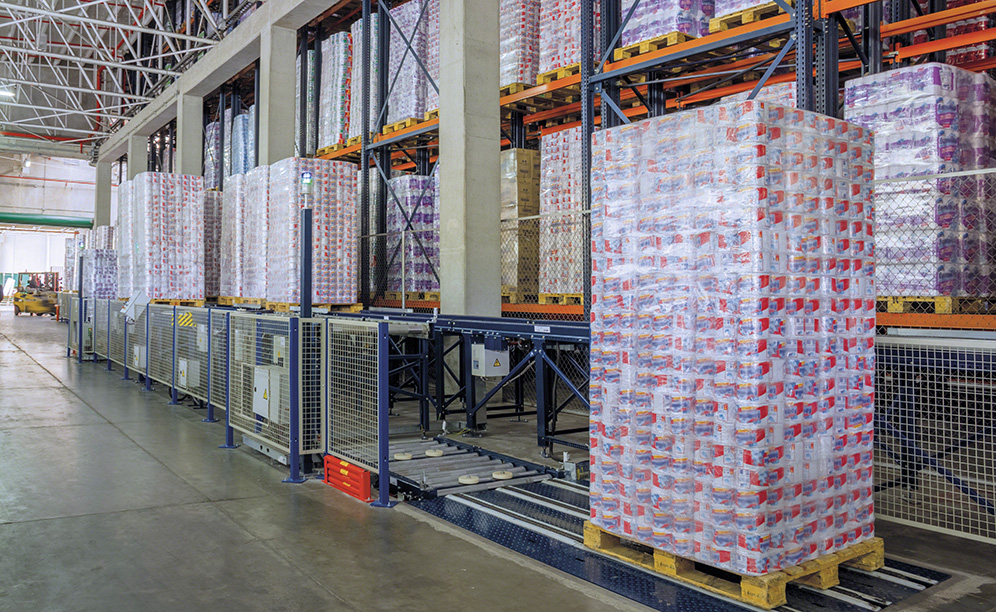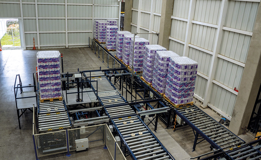Operators, aided by pallet trucks, deposit the goods on the hydraulic table that lifts loads to the level of the input conveyor. A checkpoint is responsible for validating its status before the pallet is inserted into the warehouse. If it is not up to condition, it is automatically sent back and removed from the circuit so that operators can recondition the pallet.