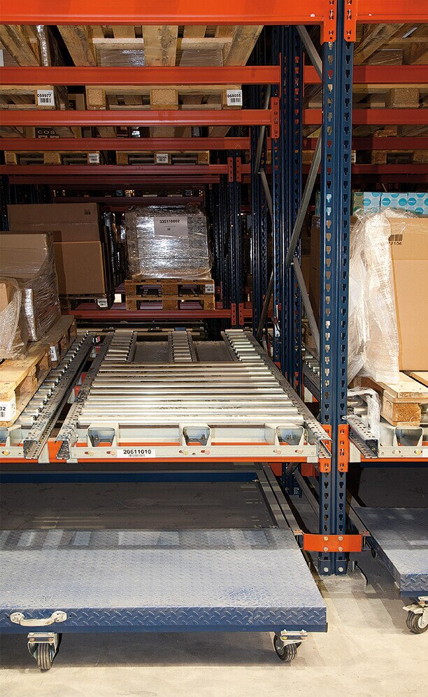 High and medium turnover (type A and B) products are stored in this warehouse, where a picking area has been set up at the front and 44 live pallet channels on the ground level of a lateral rack.