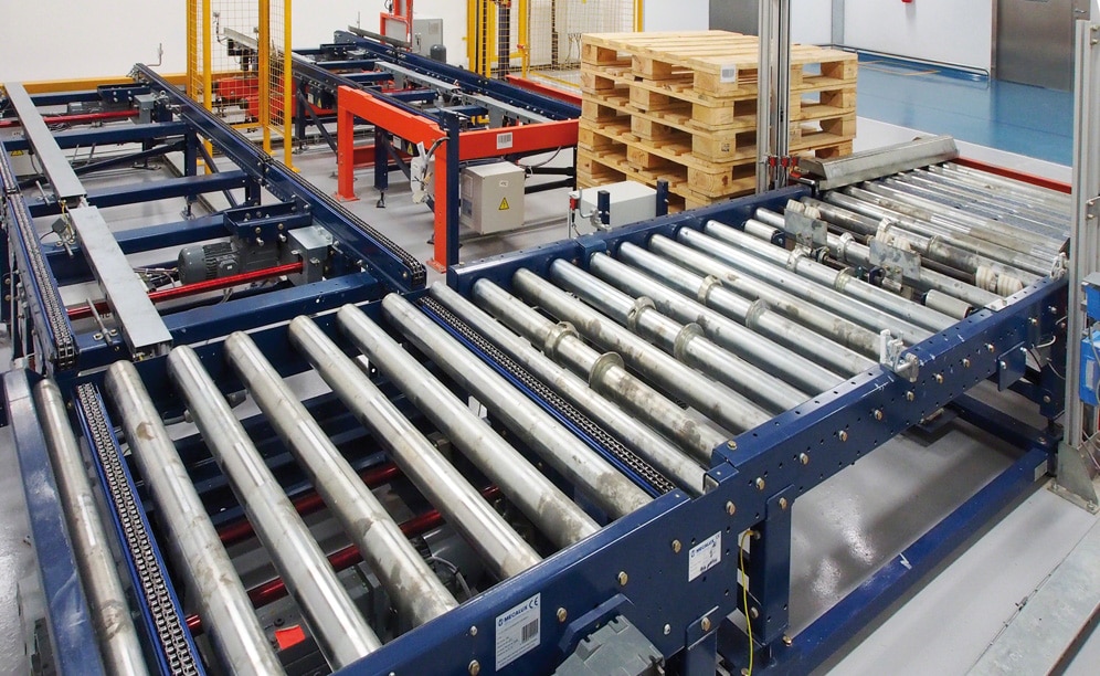 Incoming palletised goods from production are carried by means of the main conveyor circuit, which connects with the storage aisles via a transfer car. The entrance area includes three checkpoints that are responsible for verifying that the dimensions, weight and status of the pallets meet the specifications of the installation.