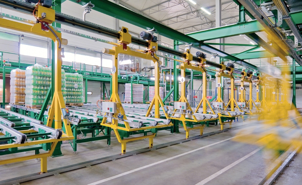 The stacker cranes are responsible for automatically extracting stored goods from the production area and bringing them to the corresponding output conveyor. Once on the conveyor, the electrified monorails directed each pallet to their assigned preload area.