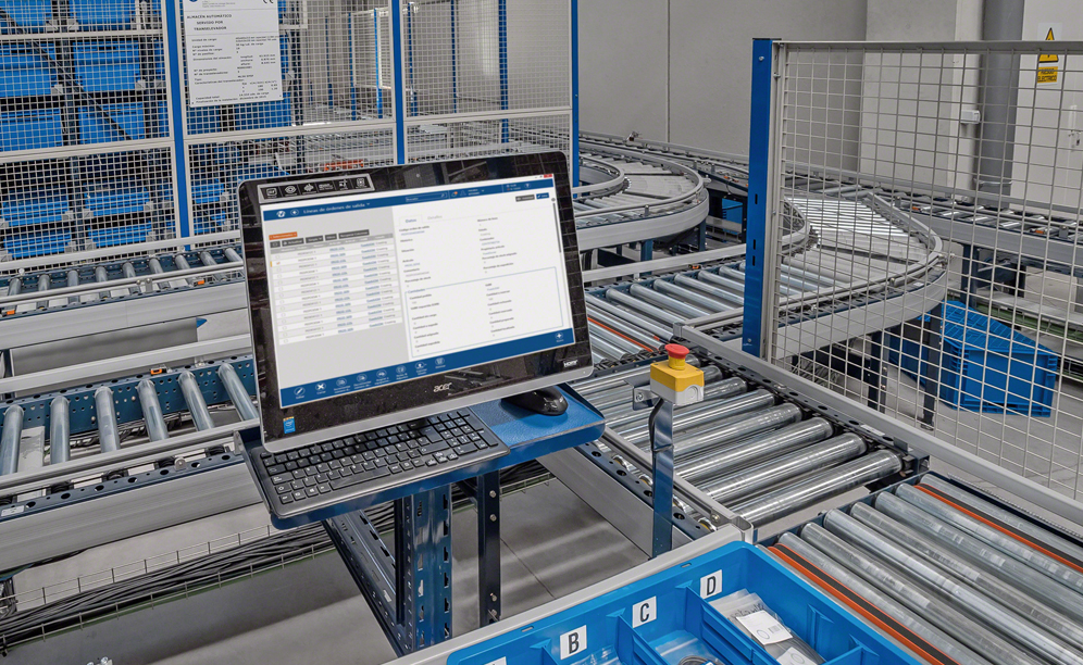 Stacker cranes place containers (Euro-boxes) with the goods on the conveyors, which automatically move them towards the picking stations. Operators extract the products that the system indicates on a screen and deposit them in the corresponding cardboard box on the picking table.