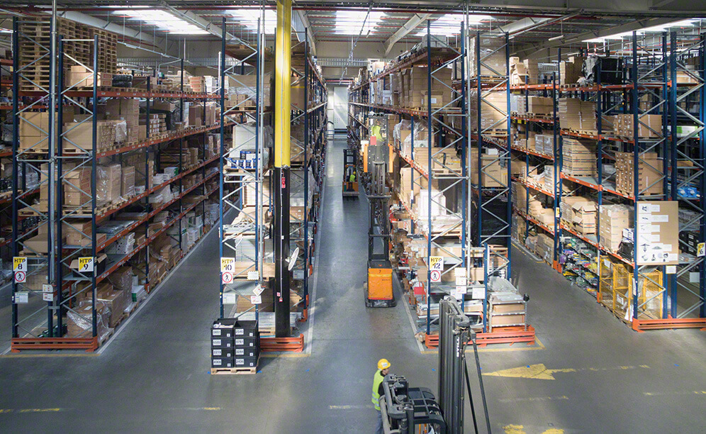 In some aisles, lower rack levels are set up to pick items directly from the pallet, while upper levels store palletised reserve stock.
