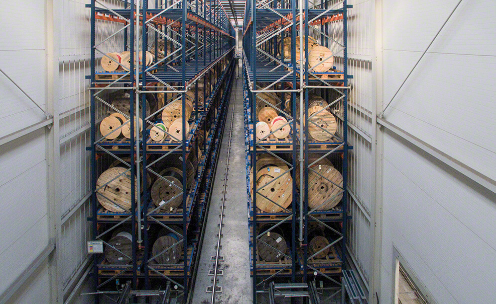 In Sector 5, there is an aisle with racks on both sides to store reels on pallets. Along the aisle is a stacker crane responsible for automatically moving the goods from the conveyors to the locations and vice versa.