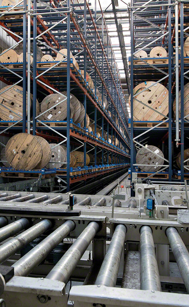 The two conveyor circuits transfer the pallet with the reel to the area where the unwinding machine and footage control are located. This machine receives and unwinds the reels to cut the metres of product requested for each order. When the process is completed, the partial reel is repalletised and placed on the incoming conveyor, so that the stacker crane can deposit it back in the racks.