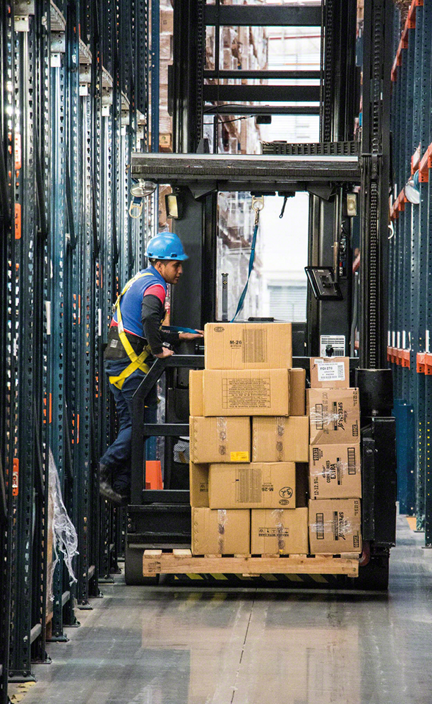 On both sides and on each floor of the picking blocks, they have placed six levels of live pallet racking with rollers that allow optimal material input and output. The goods are introduced into one end and slide by gravity to the opposite side facing the picking aisle. The operators collect the products of the first box –the ones behind it contain the same SKUs and are used as reserves. To prep orders, operators work by assigned sectors and use a handheld terminal that reports the item that must be extracted, the amount and the corresponding order.