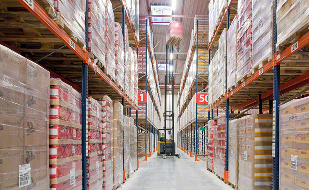 The warehouse is composed of 15 pallet rack aisles that are 9 m high and four load levels. In the lower levels, the merchandise is deposited on the floor and, in some of these, picking is directly done from the pallets by order prep machines.