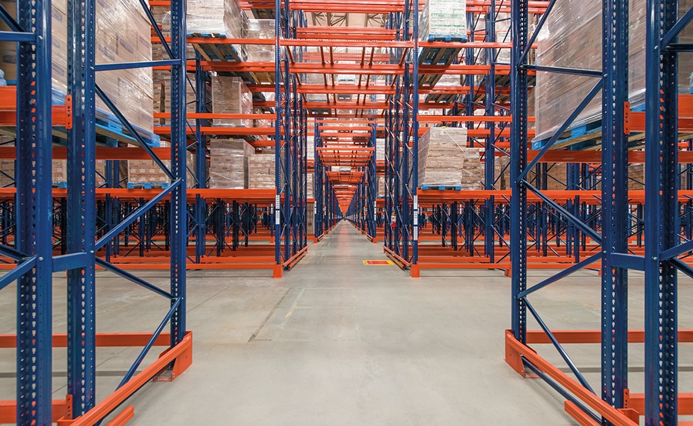 Mecalux supplied single and double-depth pallet racking that measures 11.4 m high and 152 m long, with five or six load levels.