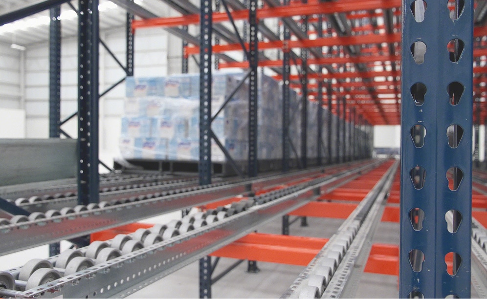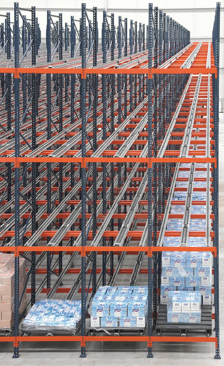 These racks ensure the perfect turnover of goods, applying the FIFO method (first-in, first-out), i.e. the first pallet in is the first out. The pallets are introduced into the highest part of the track in the load aisle. Then, they move autonomously to the opposite end and are ready to be extracted.