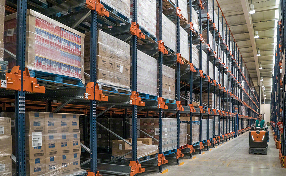 Marvimundo required a system that would enlarge the storage capacity and, in turn, offer speedy operations, similar to pallet racking, to deposit consumer products (type A). To achieve this, Mecalux has supplied a high-density block of 82.7 long racks served by the Pallet Shuttle, consisting of five levels that are 8.5 m high.