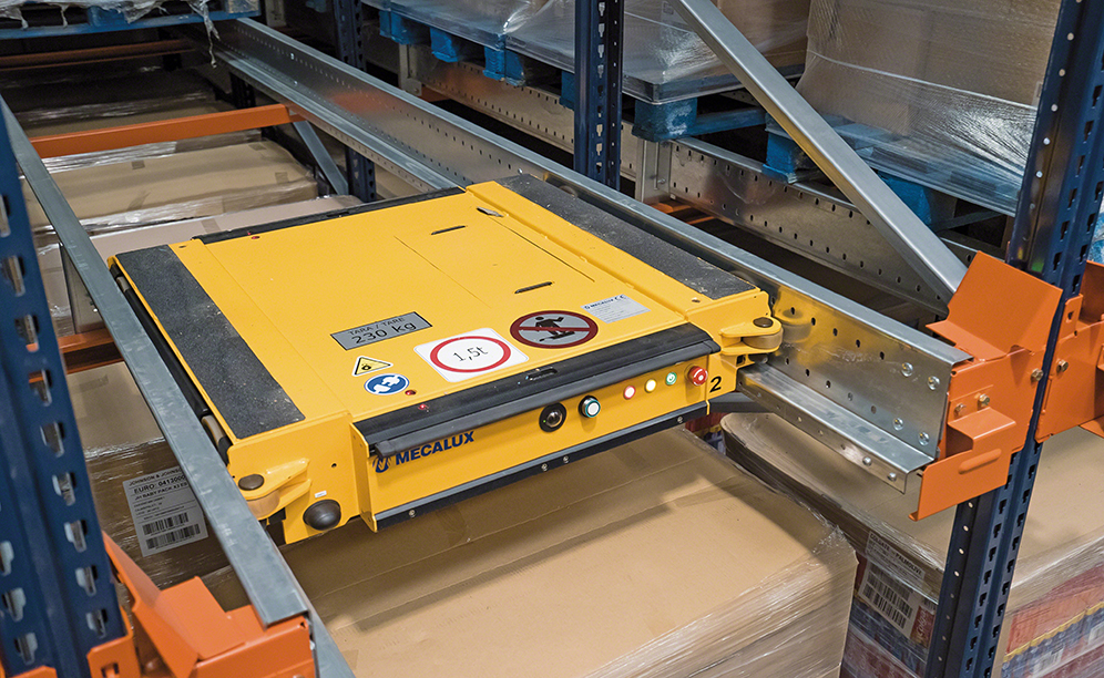 The semi-automatic Pallet Shuttle system optimises the storage capacity of the high-density racking and minimises operating times because operators do not enter the aisles to handle goods, it is the shuttle which carries out the movements autonomously.