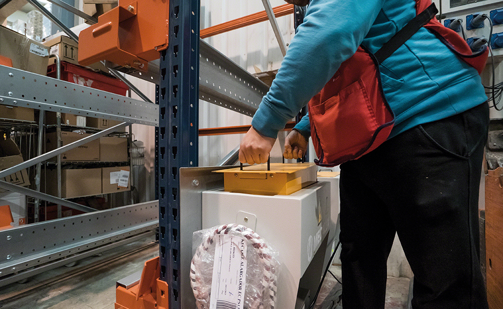 It is also fitted with a bumper that prevents any trapping and crushing; emergency stops that cut power if necessary, as well as a locking system that improves contact of the shuttle with the forks of the forklift and eliminates the risk of falling. There are also ultrasonic sensors that locate the position of the pallets in the channels so that the Pallet Shuttle is correctly placed underneath to move them.
