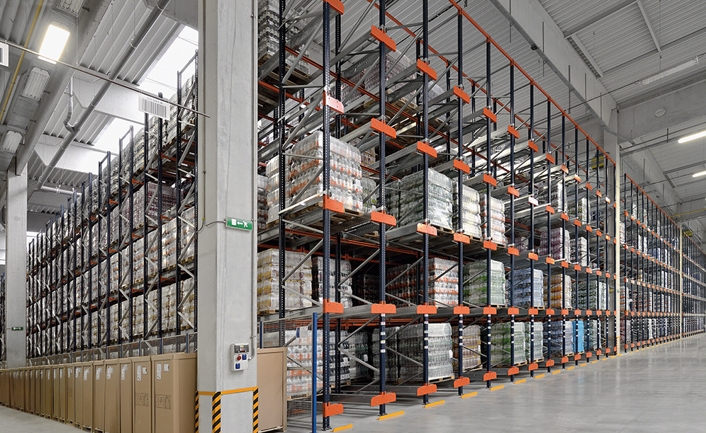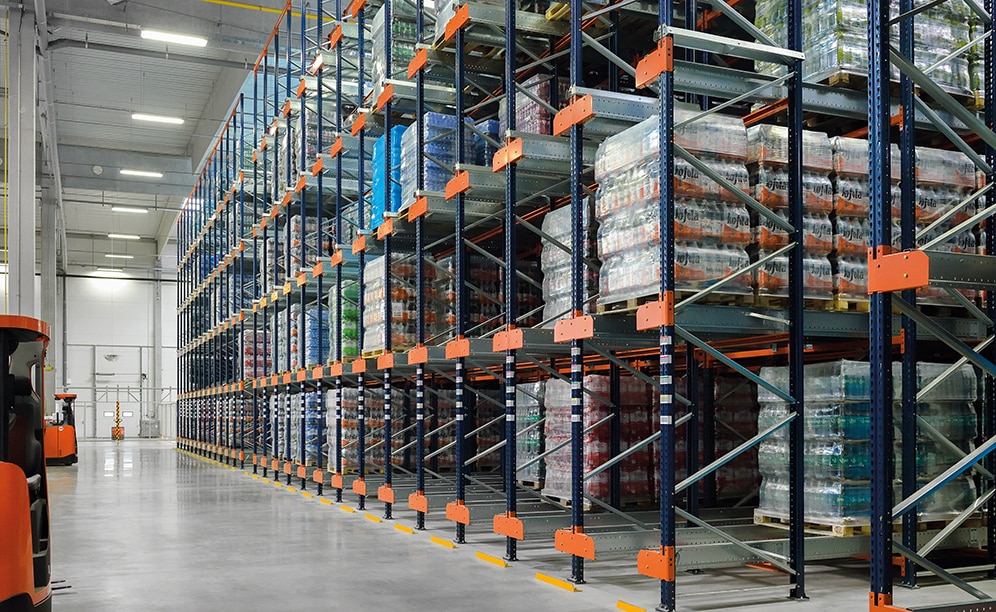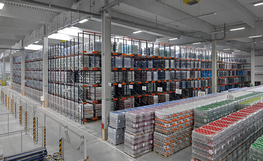 Consumer products are piled up on the floor of the warehouse in order to make full use of the space. Therefore, operators have fast and easy access to goods, avoiding unnecessary movements. This is possible because goods consist of shrink-wrapped bottles on pallets, making them sufficiently resistant for one pallet to be placed on top of another without fear of the product being damaged.
