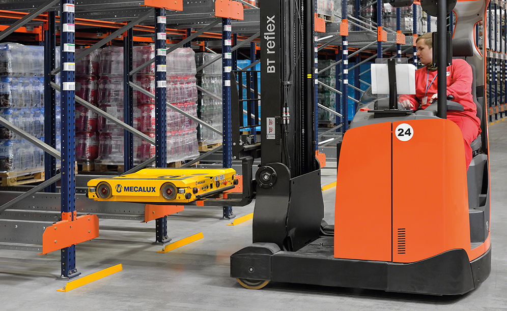 The same forklifts that are used to handle goods within the warehouse are also used to place the Pallet Shuttle in the desired channel. Once the Pallet Shuttle is loaded with a pallet, it moves horizontally until it arrives to the first open location, where it deposits the load.