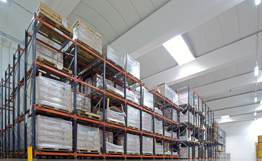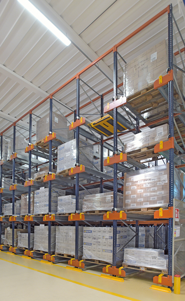 Push-back pallet racking was installed with 144 channels that store up to four pallets deep. Handling is very agile and is performed on the same side of the racks. The operators do not enter into the storage aisles, but instead introduce pallets into each channel and pallets are pushed along with the assistance of forklifts.