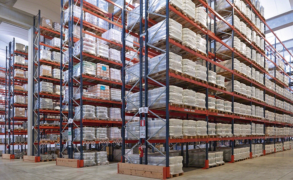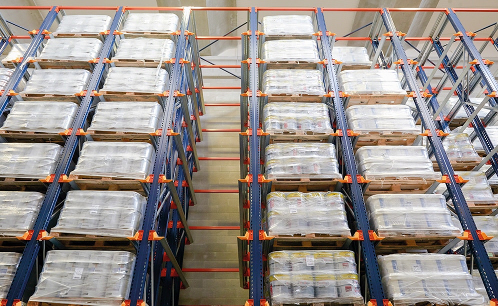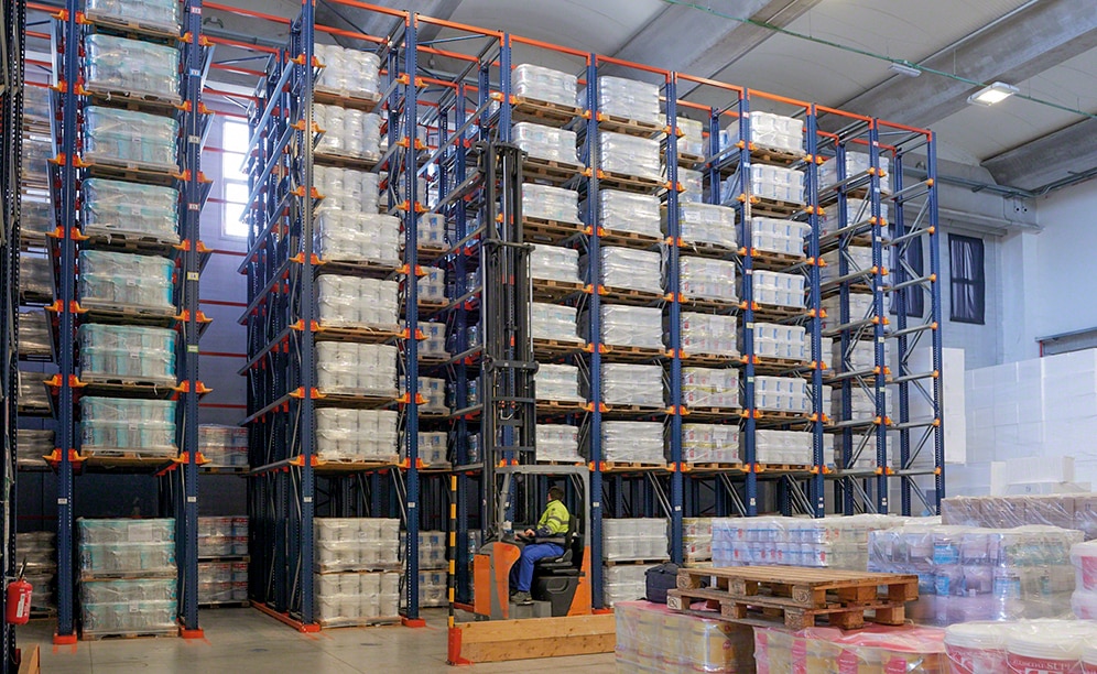 The sides of each warehouse area were arranged with 9 m high drive-in racks for the deposit of consumer products.