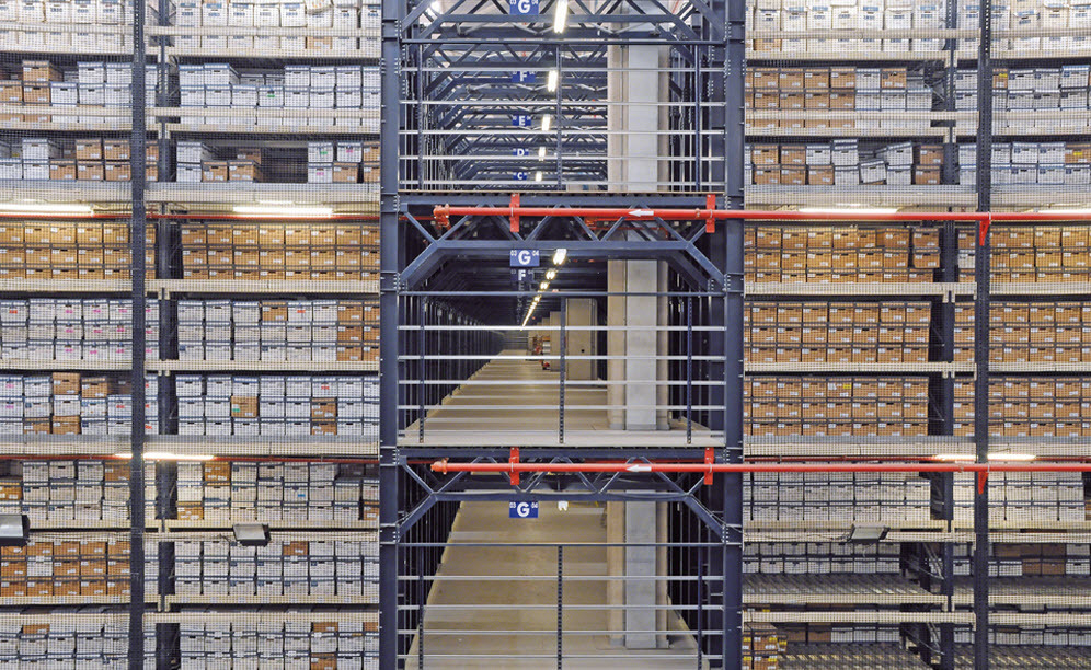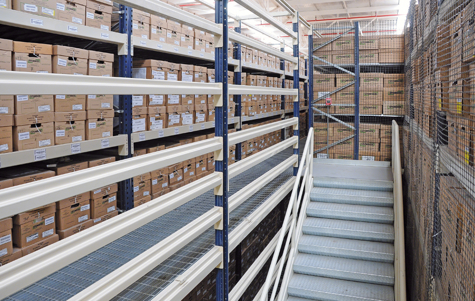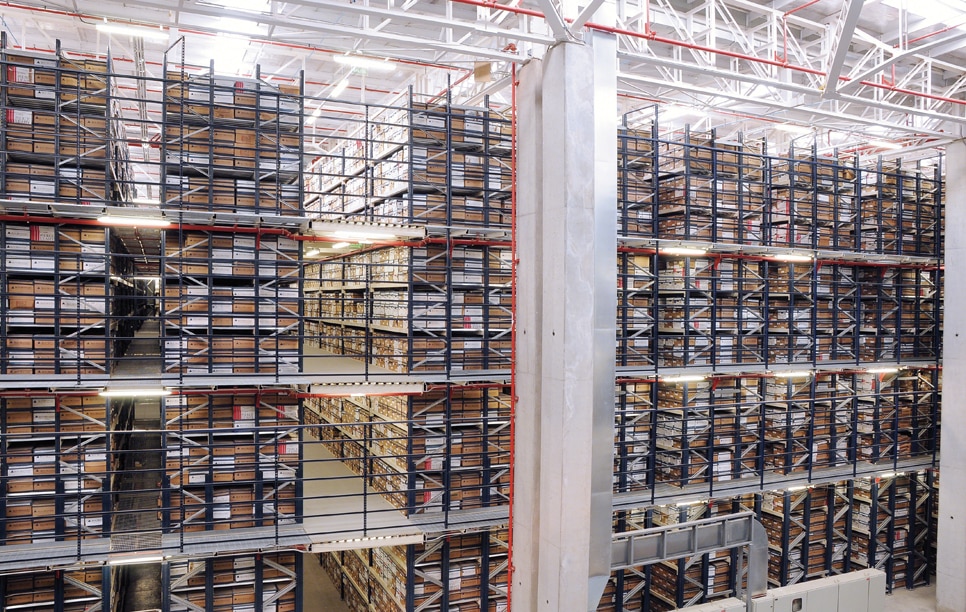 Before starting the installation of the warehouse, the racks also went through a preliminary design phase, so they would be capable of absorbing the force generated by any potential earthquakes. The warehouse, divided into four floors in order to allow manual handling of the goods, is made up of tall, high-resistance racks with shelves at different levels on which the boxes containing the files are deposited. Access to the various floors of the warehouse is performed by means of stairs, lifts and walkways.