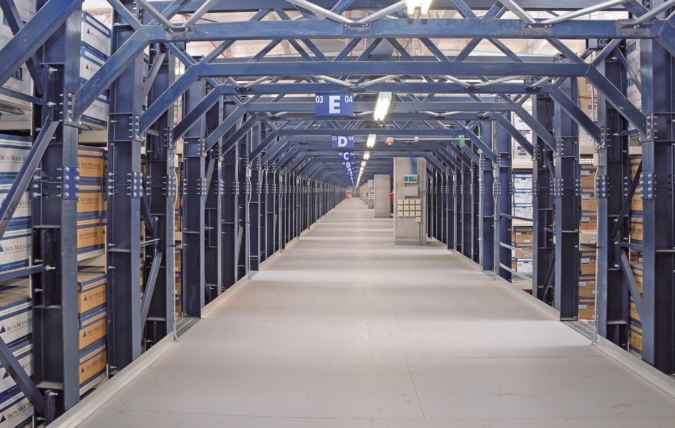 Longitudinal rigid frames to reinforce the beams and columns on the four floors of the warehouse were also installed, along with the creation of a 4 m wide central aisle that enables comfortable handling of the load at the different locations. The central frames were fixed on a base plate calculated with sufficient thickness to provide maximum absorption of the shocks, since according to the calculations made, the seismic waves would travel longitudinally through the frames.