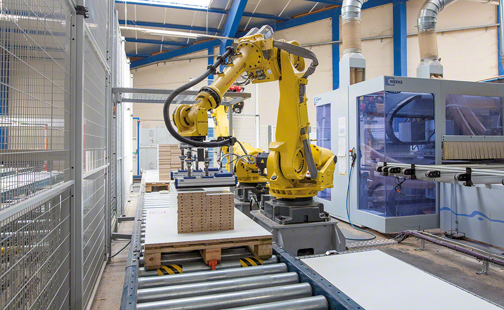 Meanwhile, there are two anthropomorphic robots enabled. One of these introduces panels into the robotised work island for them to be drilled, while the other collects the drilled panels and piles them on a pallet. Next, these pallets flow toward the end of the circuit, where a worker picks them up and moves them to the warehouse.