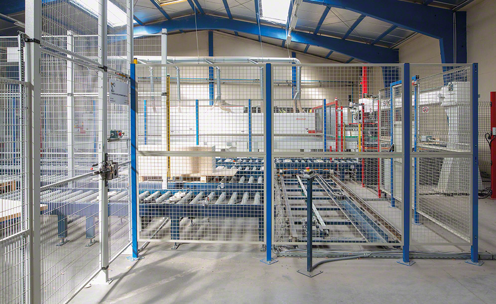 Along the circuit, two hydraulic tables raise the loads to an ergonomic position, so operators collect or insert the palletised panels with ease.
