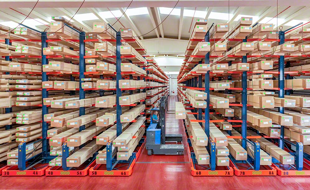 To modernise its logistics operations and support the growth of its business, the company decided to install mobile cantilever racking from Mecalux in its warehouse in Sax, where it manages 458 SKUs. This efficient high-density storage system houses extra-long merchandise while leveraging the storage space and maintaining direct access to the goods. The racks are installed on structures with wheels — activated by integrated motors — that move along rails.