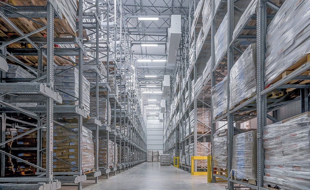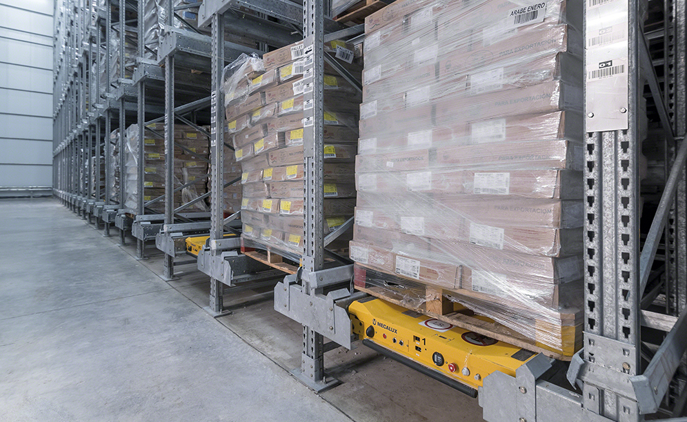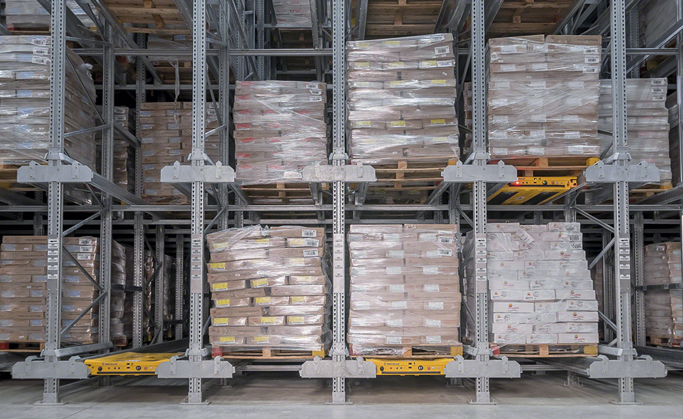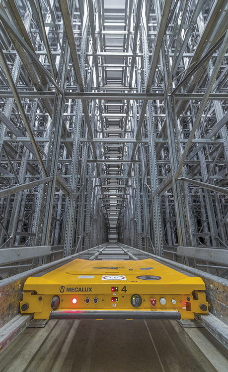 The facility is 14 m high and equipped with the high-density Pallet Shuttle system, with 150 storage channels that have the capacity to deep-store 22 pallets. The loading and unloading of goods are carried out thanks to four electric shuttles that move autonomously along rails inside the racks.
