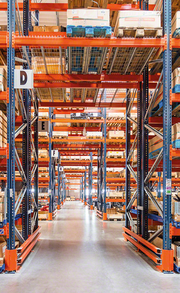 The warehouse is composed of two aisles with double-deep racking on both sides that measure 47 m long, 9 m high and have 17 shelves.