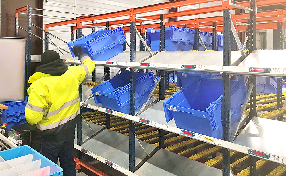 This racking is 2 m high, comprising slightly inclined platforms with rollers, causing the boxes to slide via gravity to the end of the lane. The benefit of this solution is that, once operators have completed a box, they push it to the other side of the racking, where it slides automatically to the dispatch area.