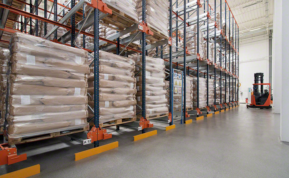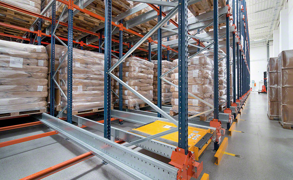 The Pallet Shuttle operated block of racks runs down the centre of the warehouse, with a work aisle on either side: one for entries and another for exits. The load is managed via the FIFO method (the first pallet to enter is the first to leave).