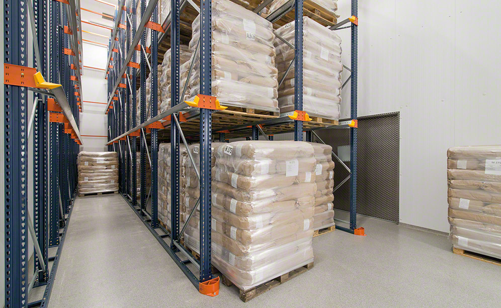 Mecalux has installed 6 rows of drive-in pallet racks in each heated installation. These 5.4 m high blocks comprise three levels where pallets can be deposited seven deep, accommodating a total of 378 pallets. Each rack channel is equipped with support rails and pallet centralisers for proper insertion of the loads. Stored products can be accessed from a single aisle through a LIFO (last in, first out) method.