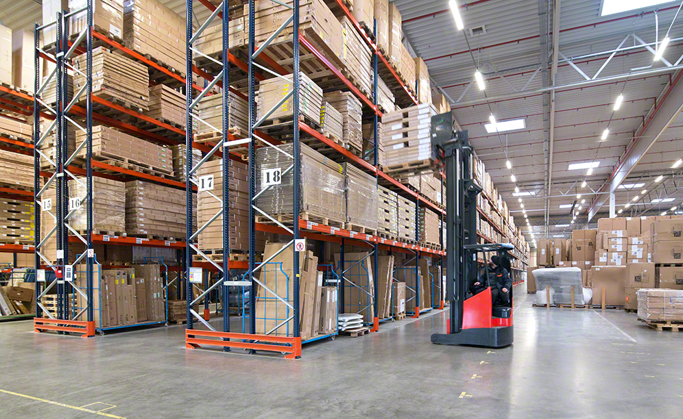 HSF e-commerce has equipped its logistics centre in Sady (Poland) with 122 m long Mecalux pallet racks that provide a storage capacity for 11,592 pallets. More than 10,000 SKUs of different volumes and dimensions are managed in this warehouse. The direct access to the racks quickens storage tasks and prep of 2,000 orders a day.