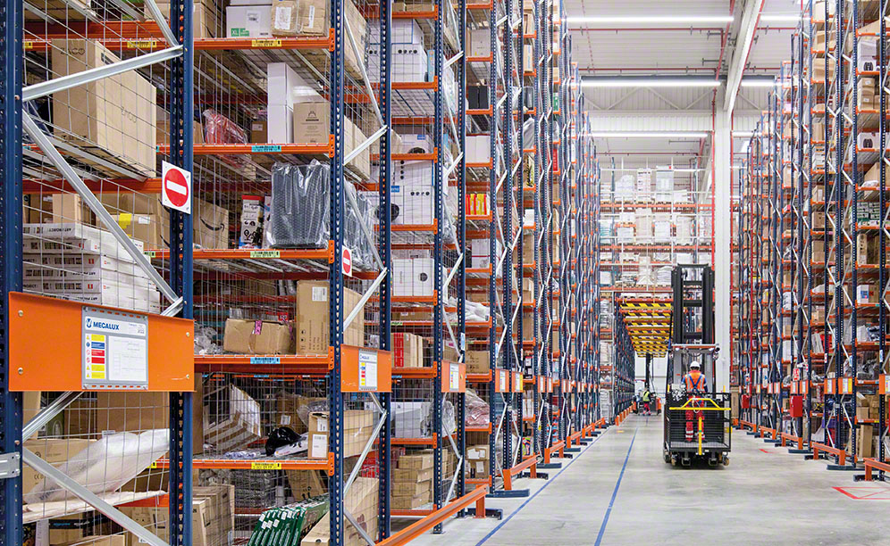 The pallet racks stand out for their strength, versatility and adaptability to any type of load. Moreover, their configuration has made it possible to install wire mesh panels on the different levels of the racking to house boxes and other small products. Operators mainly work with reach trucks to insert and remove pallets from their locations and with order pickers to prepare orders.